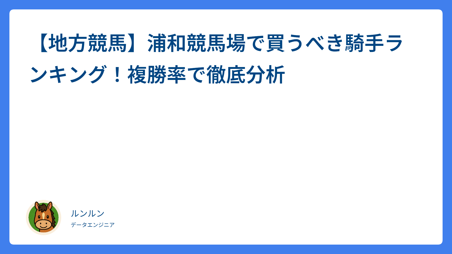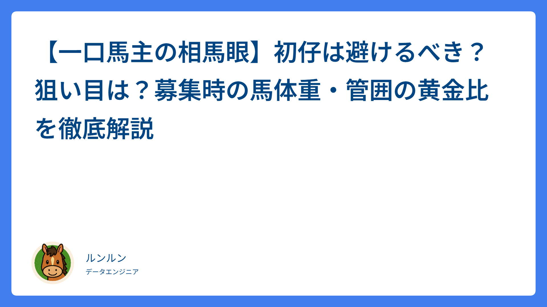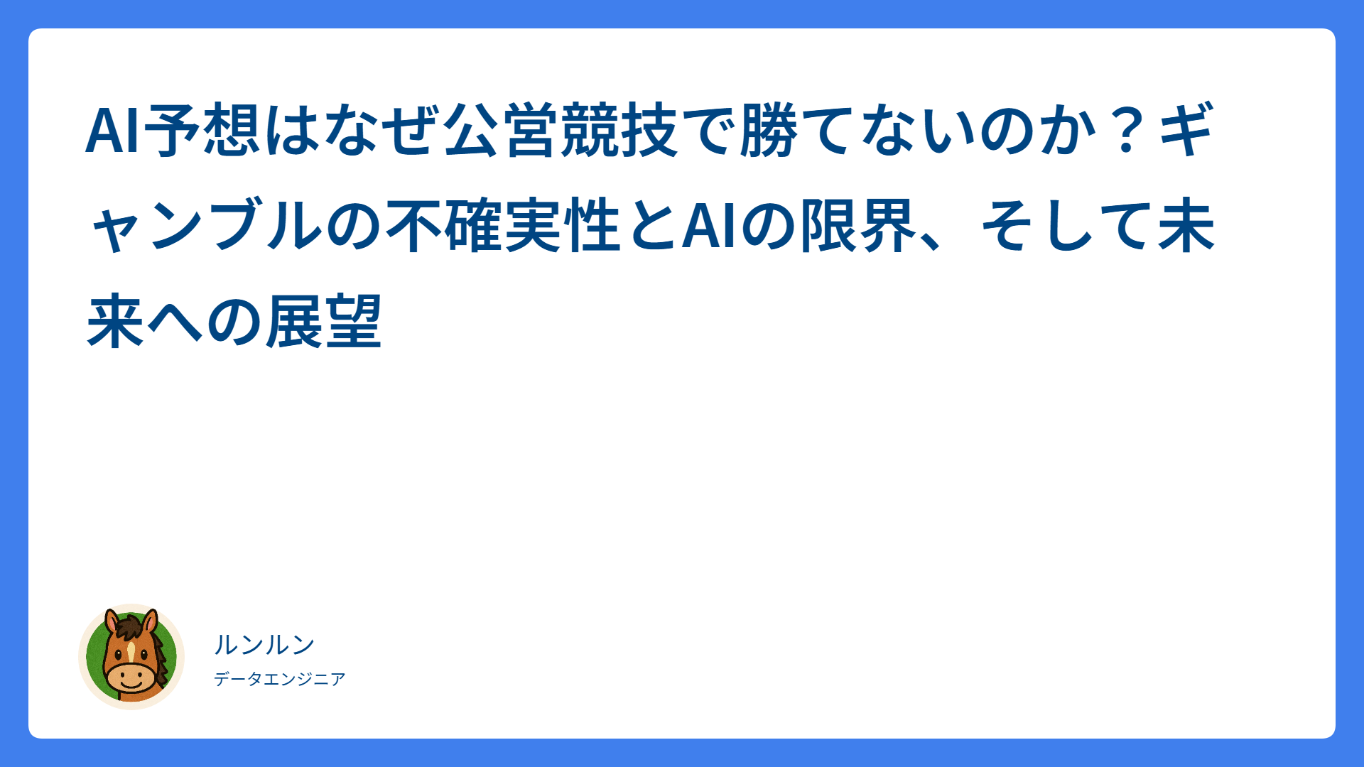 ARCHIVES 2025年12月 【一口馬主の相馬眼】初仔は避けるべき?狙い目は?募集時の馬体重・管囲の黄金比を徹底解説 2025.12.31 競馬あるある saratogax 明日の馬券に役立つ競馬データ分析 AI予想はなぜ公営競技で勝てないのか?ギャンブルの不確実性とAIの限界、そして未来への展望 2025.12.30 競馬あるある saratogax 明日の馬券に役立つ競馬データ分析 【オートレース予想術】試走タイムだけで勝てるほど甘くない!「試走偏差」と「路面条件」で中穴を射止めるロジカル攻略法 2025.12.30 オートレース saratogax 明日の馬券に役立つ競馬データ分析 【地方競馬】帯広競馬場で買うべき騎手ランキング!複勝率で徹底分析 2025.12.30 地方競馬 saratogax 明日の馬券に役立つ競馬データ分析 【地方競馬】川崎競馬場で買うべき騎手ランキング!複勝率で徹底分析 2025.12.29 地方競馬 saratogax 明日の馬券に役立つ競馬データ分析 【地方競馬】船橋競馬場で買うべき騎手ランキング!複勝率で徹底分析 2025.12.29 地方競馬 saratogax 明日の馬券に役立つ競馬データ分析 【地方競馬】浦和競馬場で買うべき騎手ランキング!複勝率で徹底分析 2025.12.29 地方競馬 saratogax 明日の馬券に役立つ競馬データ分析 【地方競馬】姫路競馬場で買うべき騎手ランキング!複勝率で徹底分析 2025.12.29 地方競馬 saratogax 明日の馬券に役立つ競馬データ分析 【地方競馬】名古屋競馬場で買うべき騎手ランキング!複勝率で徹底分析 2025.12.29 地方競馬 saratogax 明日の馬券に役立つ競馬データ分析 【地方競馬】盛岡競馬場で買うべき騎手ランキング!複勝率で徹底分析 2025.12.29 地方競馬 saratogax 明日の馬券に役立つ競馬データ分析 もっと見る