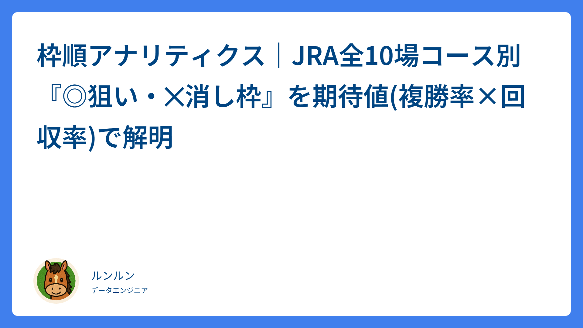 本記事では、過去のデータに基づいて「枠順アナリティクス(現代版ラッキーゲートのようなイメージ)」として、枠順ごとの成績・回収率を分析し、印(◎✕)でわかりやすく評価します。